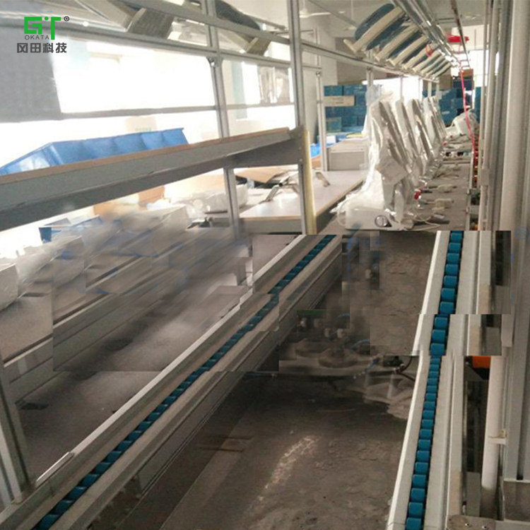 分組成,工作臺板由夾板膠皮制作,倍帶鏈線作為工位間零部件傳送線,很好的銜接了工位間的工序,節(jié)省人力時間。